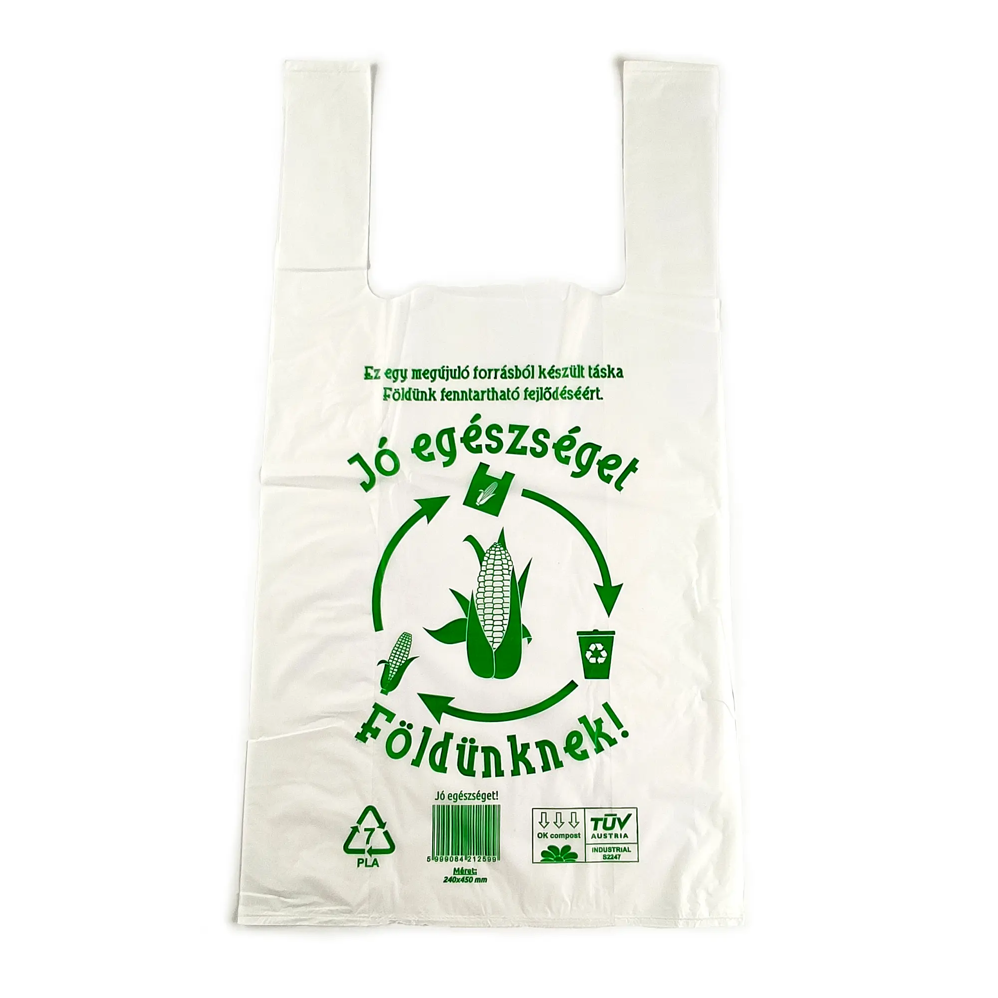 Ingvállas táska (bevásárló táska, reklámtáska, hordtáska néven is ismert). Megújuló forrásból származó, kukoricakeményítő (PLA) alapú anyagból készül, komposztálható. A táska megfelel az MSZ EN 13432:2000 szabványnak.