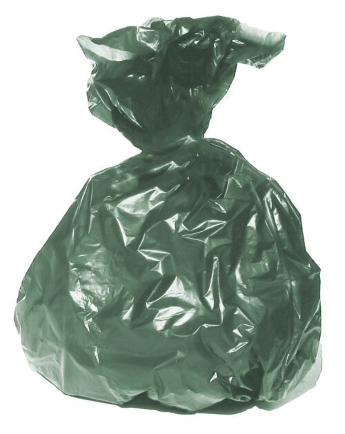 Erős polietilén zsák rolnizva zöld színben. Környezetbarát, mert újrahasznosított anyagot tartalmaz.