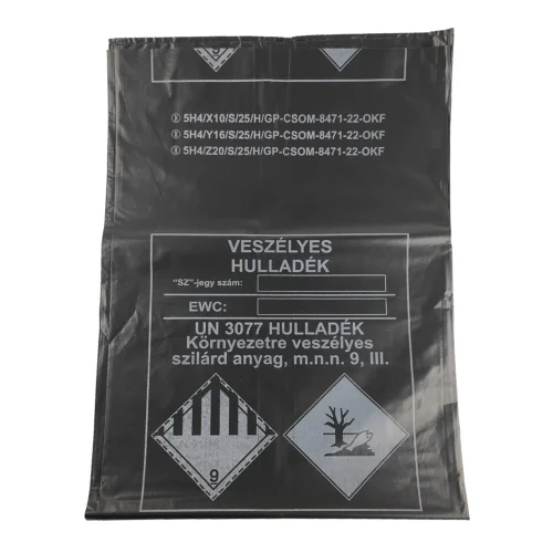 Erős polietilén, nemzetközi szabványnak megfelelő zsák lapra hajtva, veszélyes hulladék gyűjtésére, tárolására és szállítására.